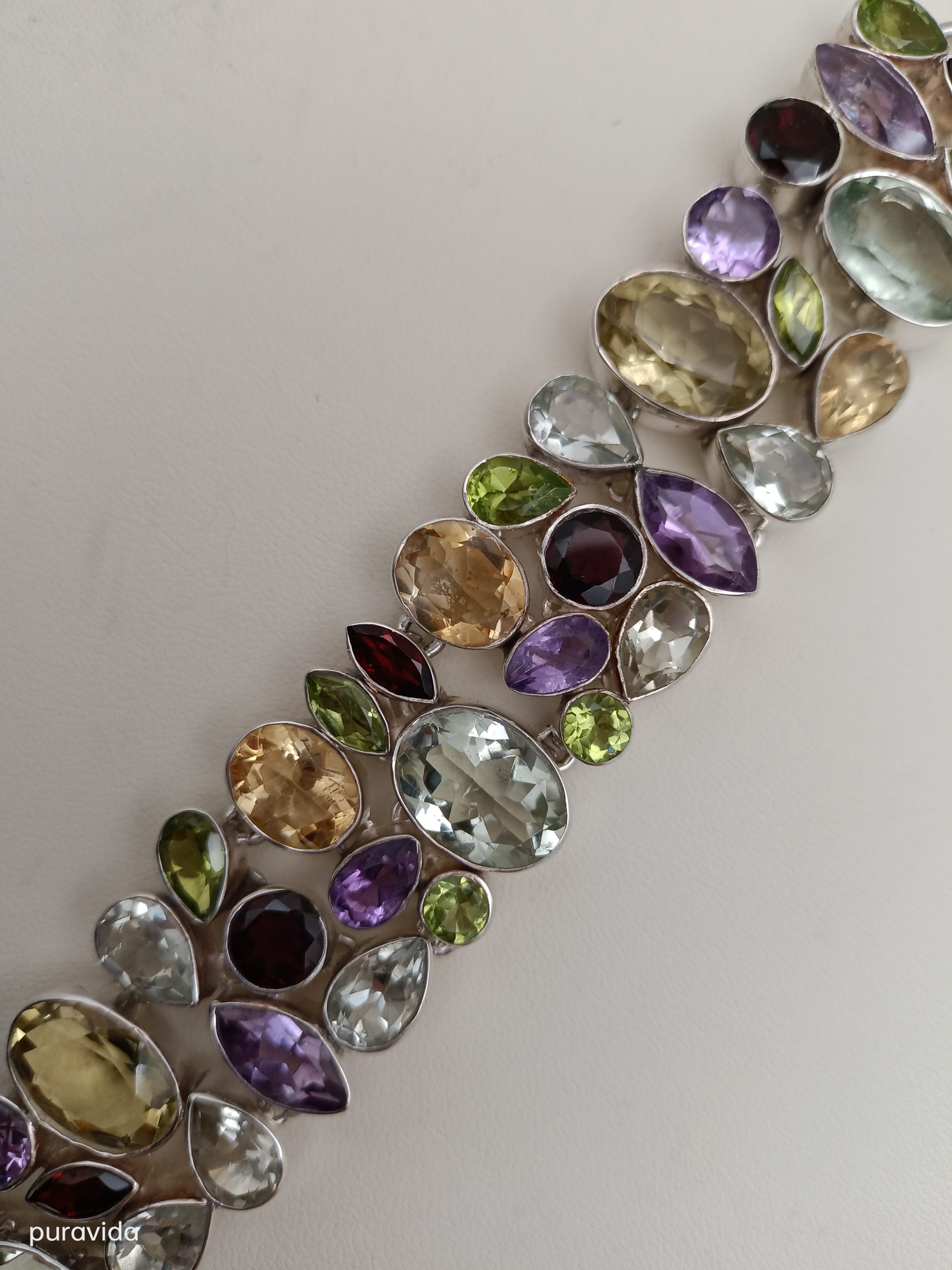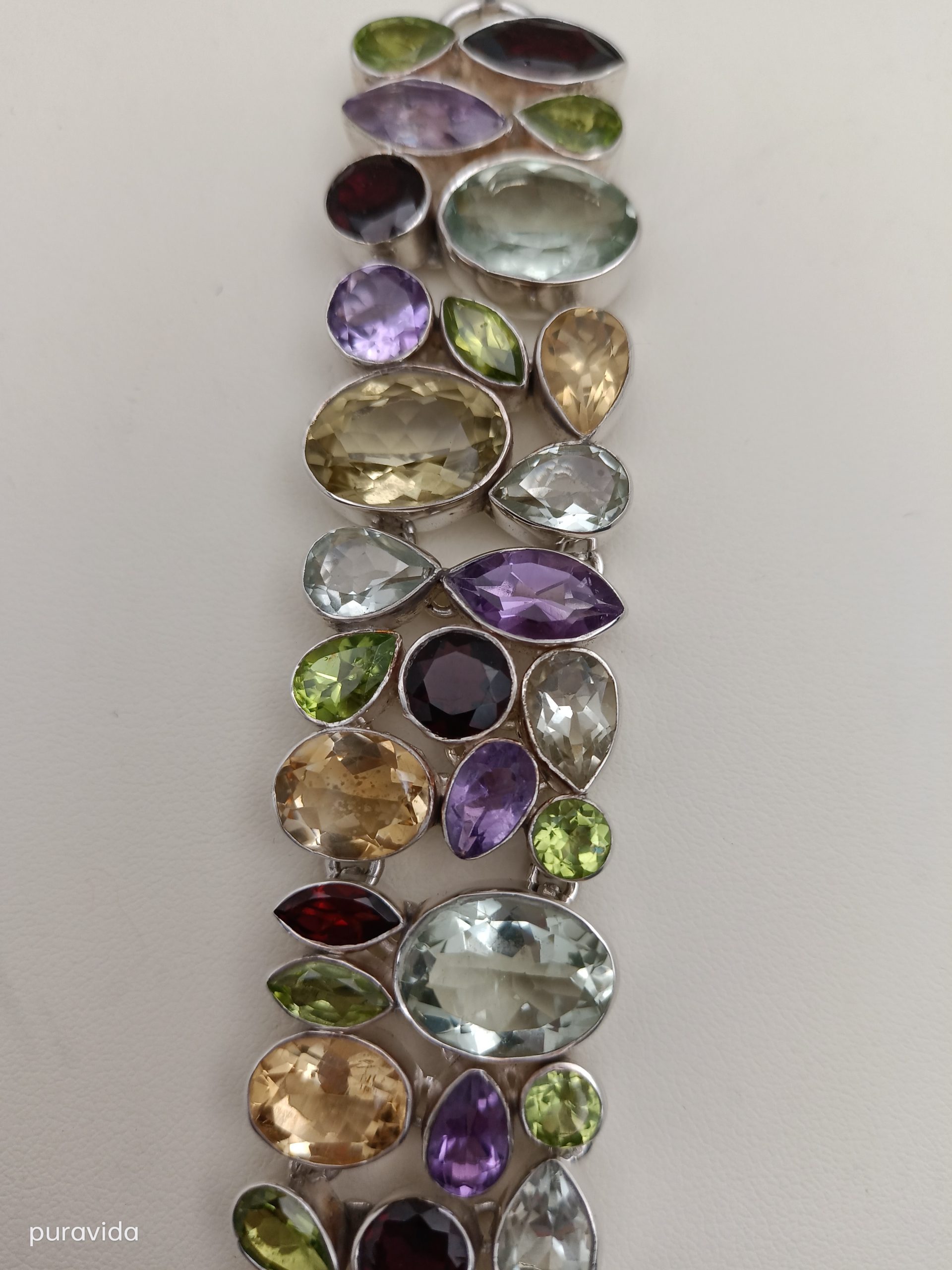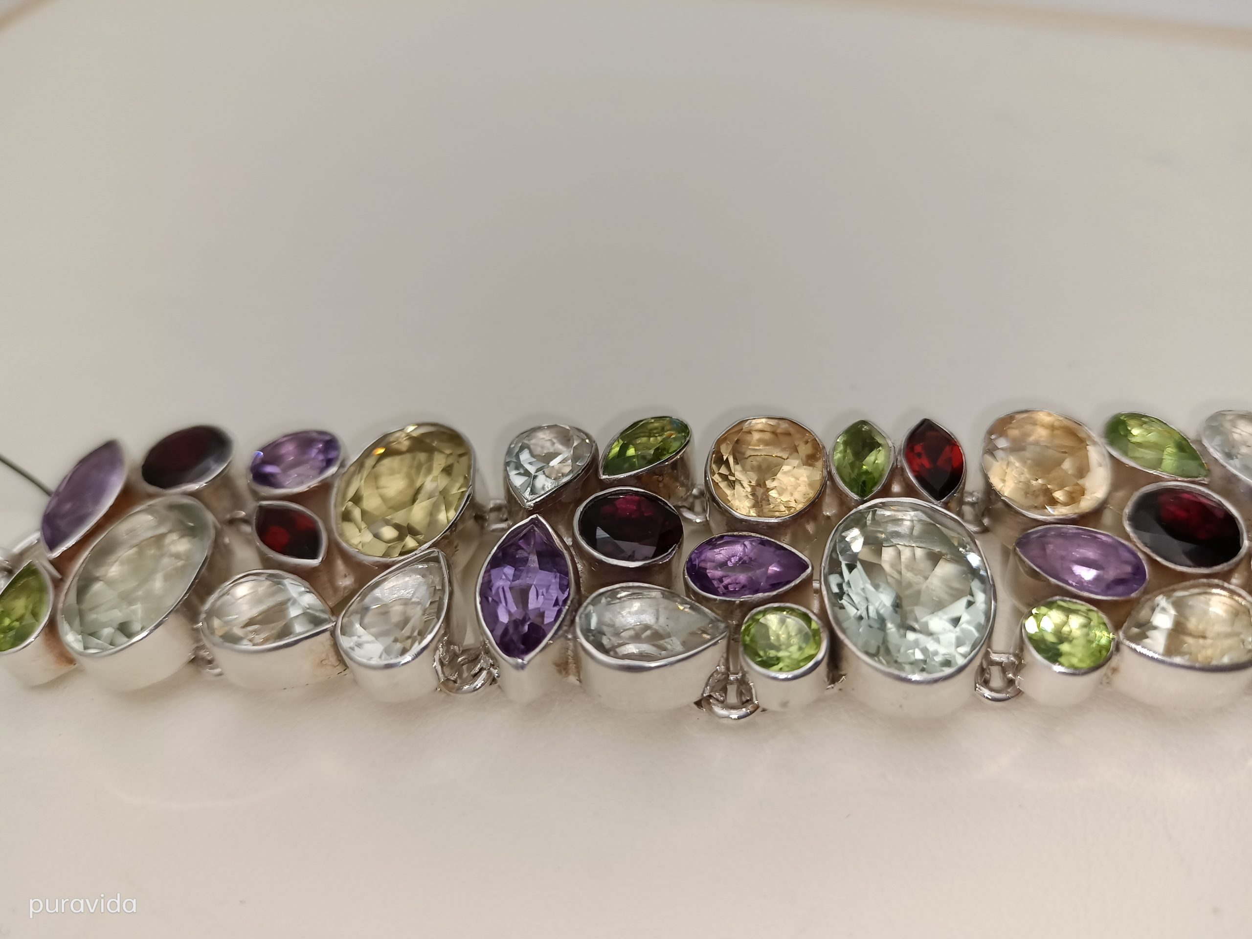 Pulsera de plata, realizada artesanalmente, agrupando distintas gemas y de diferentes tallas, tales como AMATISTAS, CRISTAL DE ROCA, CITRINO, OLIVINAS Y GRANATES.
