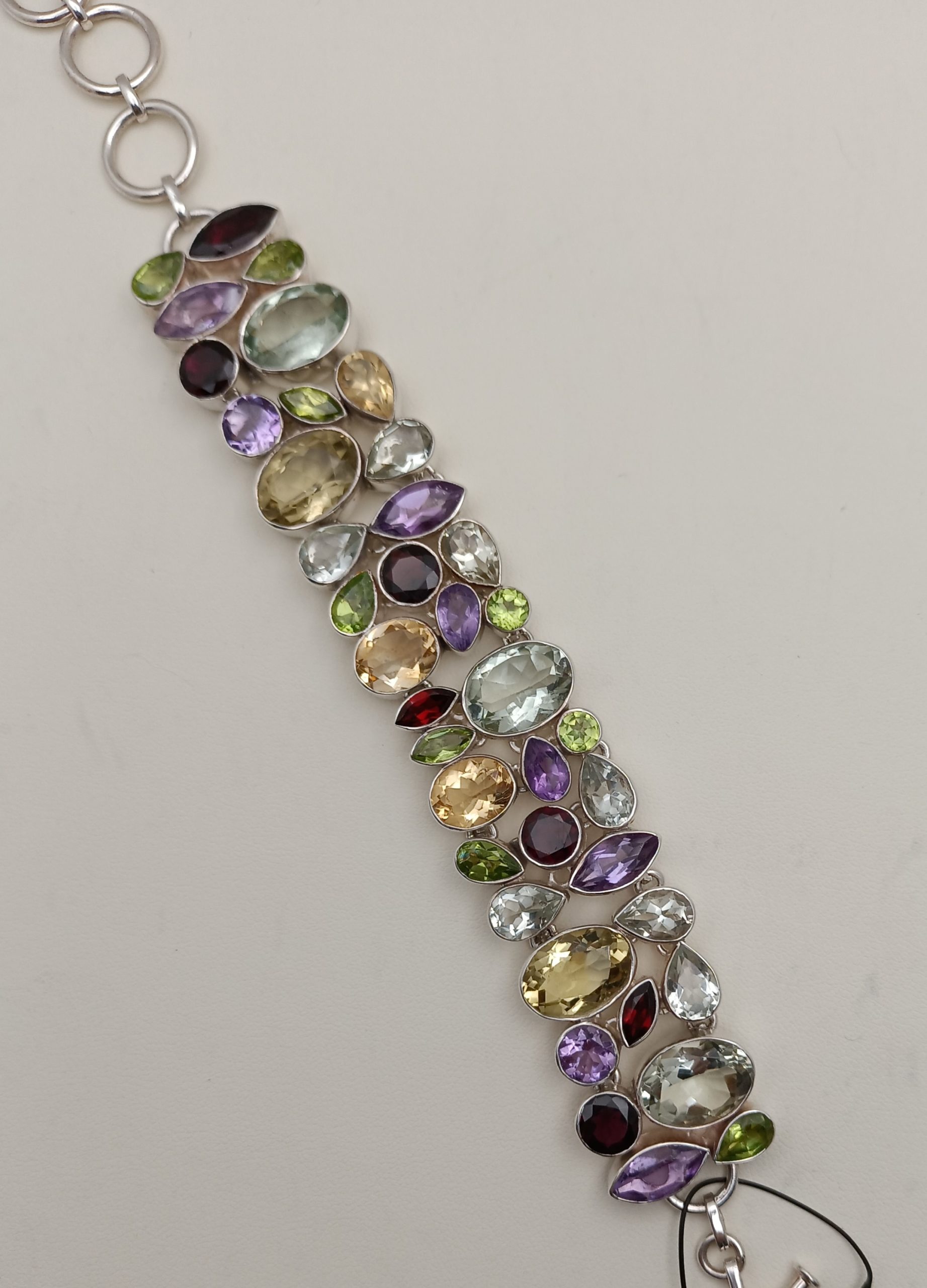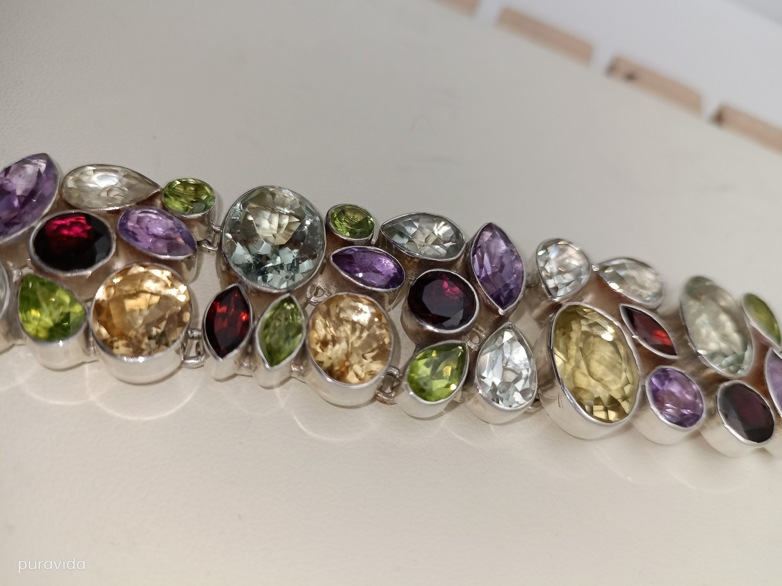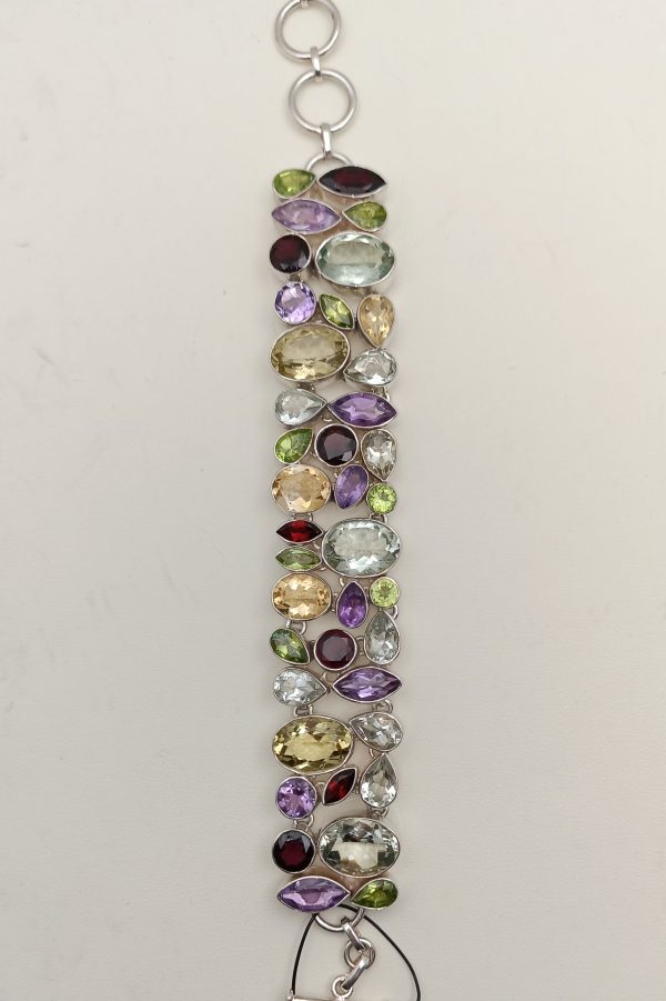 Pulsera de plata, realizada artesanalmente, agrupando distintas gemas y de diferentes tallas, tales como AMATISTAS, CRISTAL DE ROCA, CITRINO, OLIVINAS Y GRANATES.